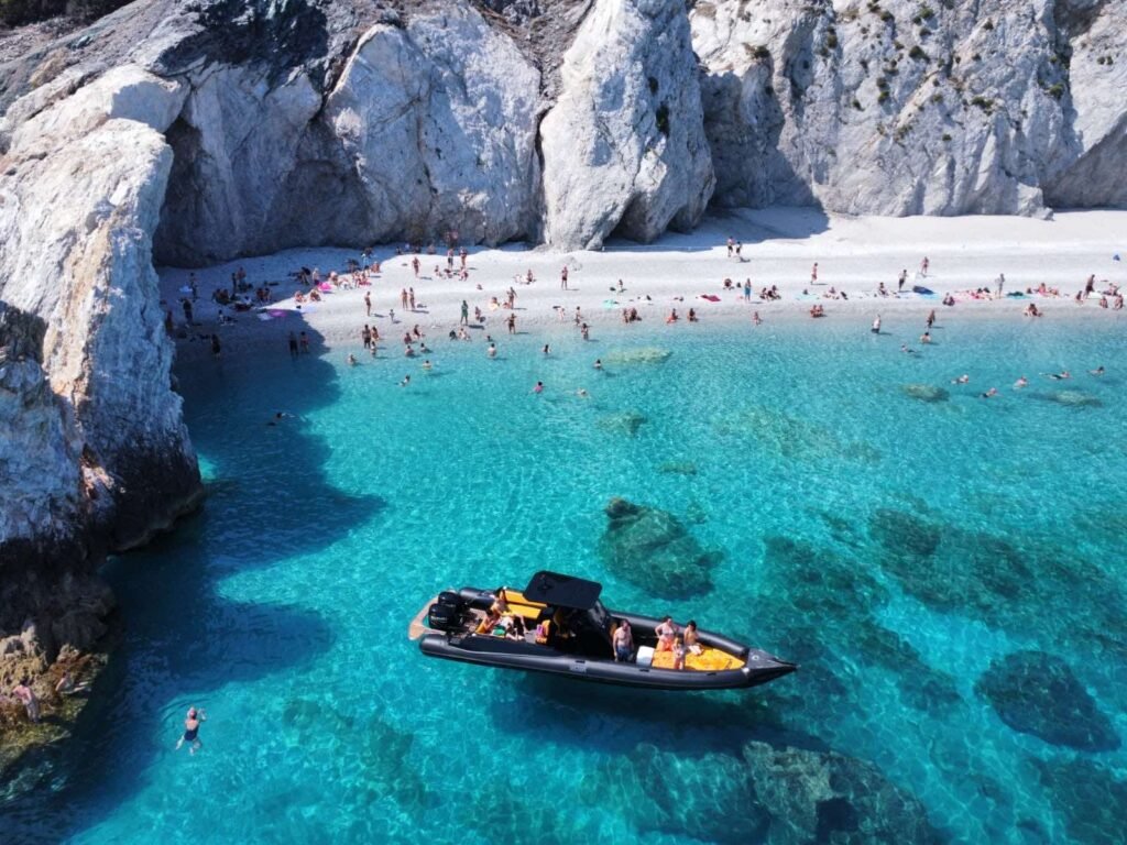 Lalaria Beach stands as one of the most iconic and breathtaking destinations in Skiathos. Accessible only by boat, this secluded paradise is a highlight for those seeking an exclusive experience with private cruises in Skiathos or exploring the island through boat rentals in Skiathos.